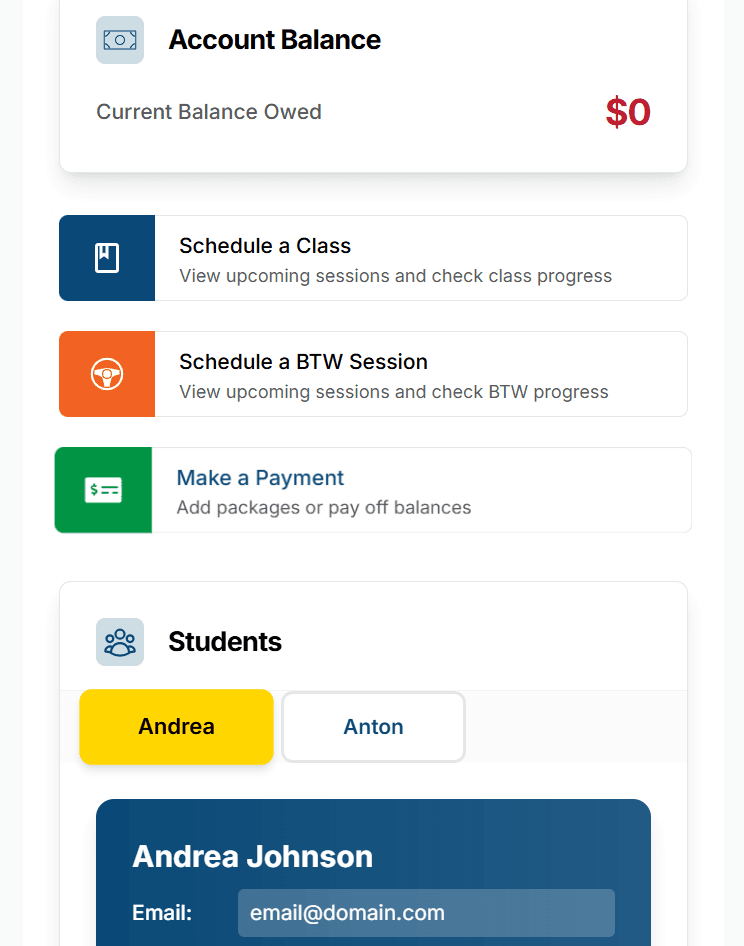 Students and families get access to our all-in-one user dashboard - making it so easy to register, schedule and track your progress!